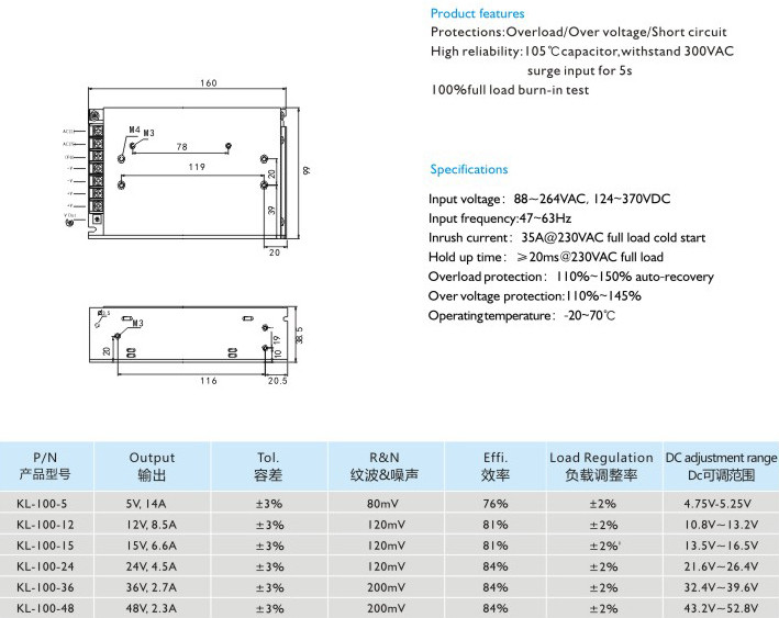 高可靠性:105C長壽命電容,能承受300VAC輸入電壓5秒不損壞 100滿載老化測試 輸入電壓:88-132VAC,176-264VDC,249-370VDC 輸入頻率:47~63Hz 沖擊電流:35A@230VAC滿載冷態(tài) 保持時(shí)間:≥20ms@230VAC滿載 過載保護(hù):110%-150%自動(dòng)恢復(fù) 過壓保護(hù):110%~145% 運(yùn)行溫度:-20-70℃" />